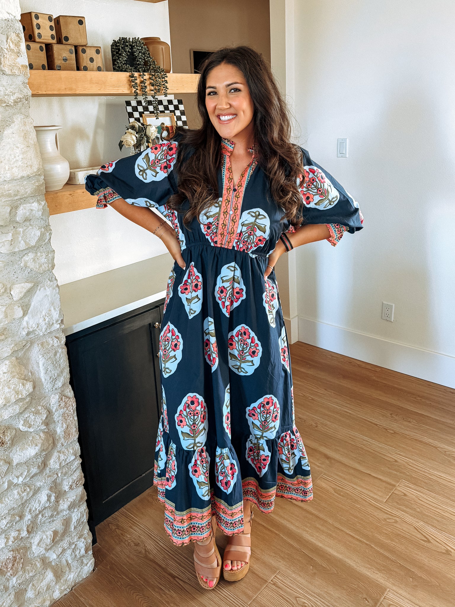 Navy Dress with Coral Floral Pattern